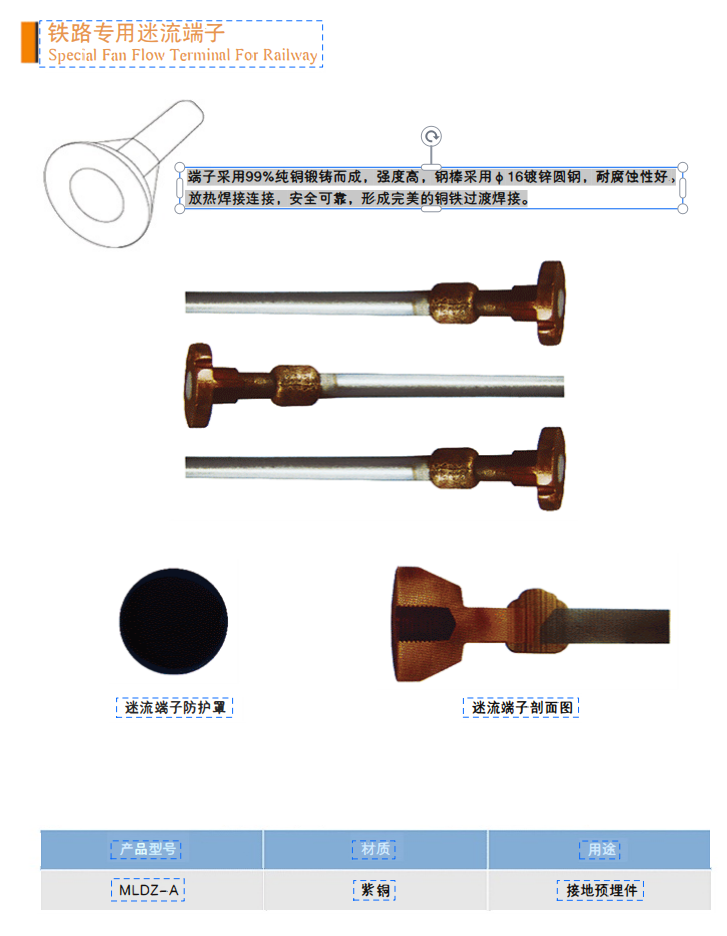 端子采用99%純鋼鍛鑄而成,強(qiáng)度高,鋼棒采用φ16鍍鋅圓鋼,耐腐性性好。放熱焊接連接,安全可靠,形成完美的鋼鐵過渡焊接。